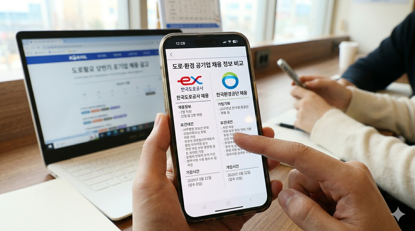 도로와 환경 관련 공기업 채용 정보를 비교하는 모습