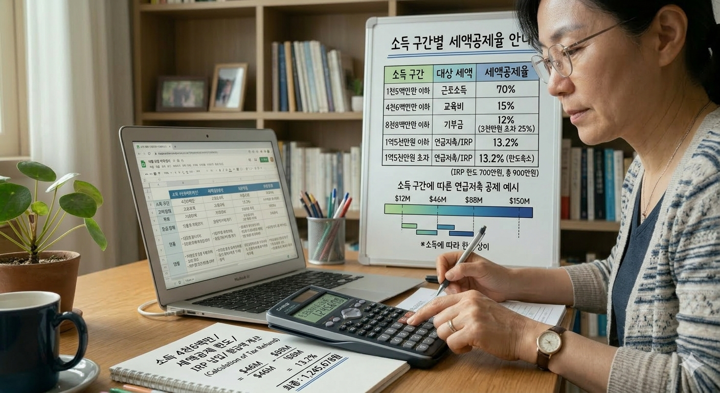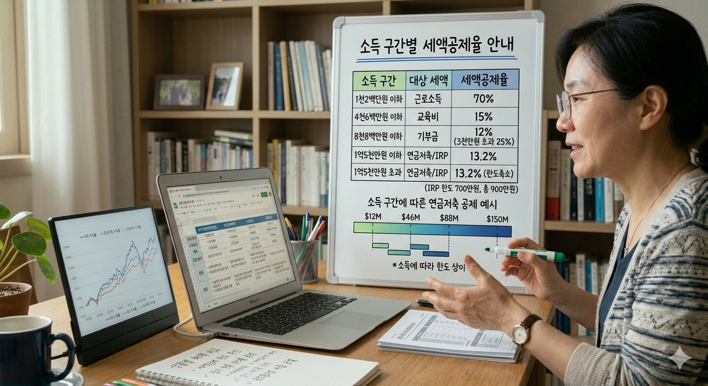 연금저축과 IRP의 세액공제율은 모든 사람에게 동일하게 적용되는 것이 아닙니다. 자신의 소득 수준에 따라 적용되는 공제율이 달라지므로, 이를 정확히 파악하는 것이 절세 전략의 핵심입니다.