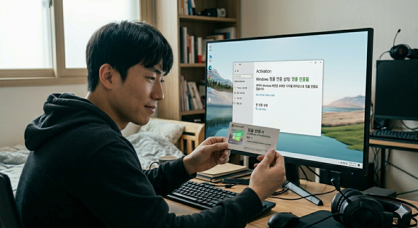 컴퓨터 화면에서 윈도우 정품 인증의 중요성을 보여주는 이미지
