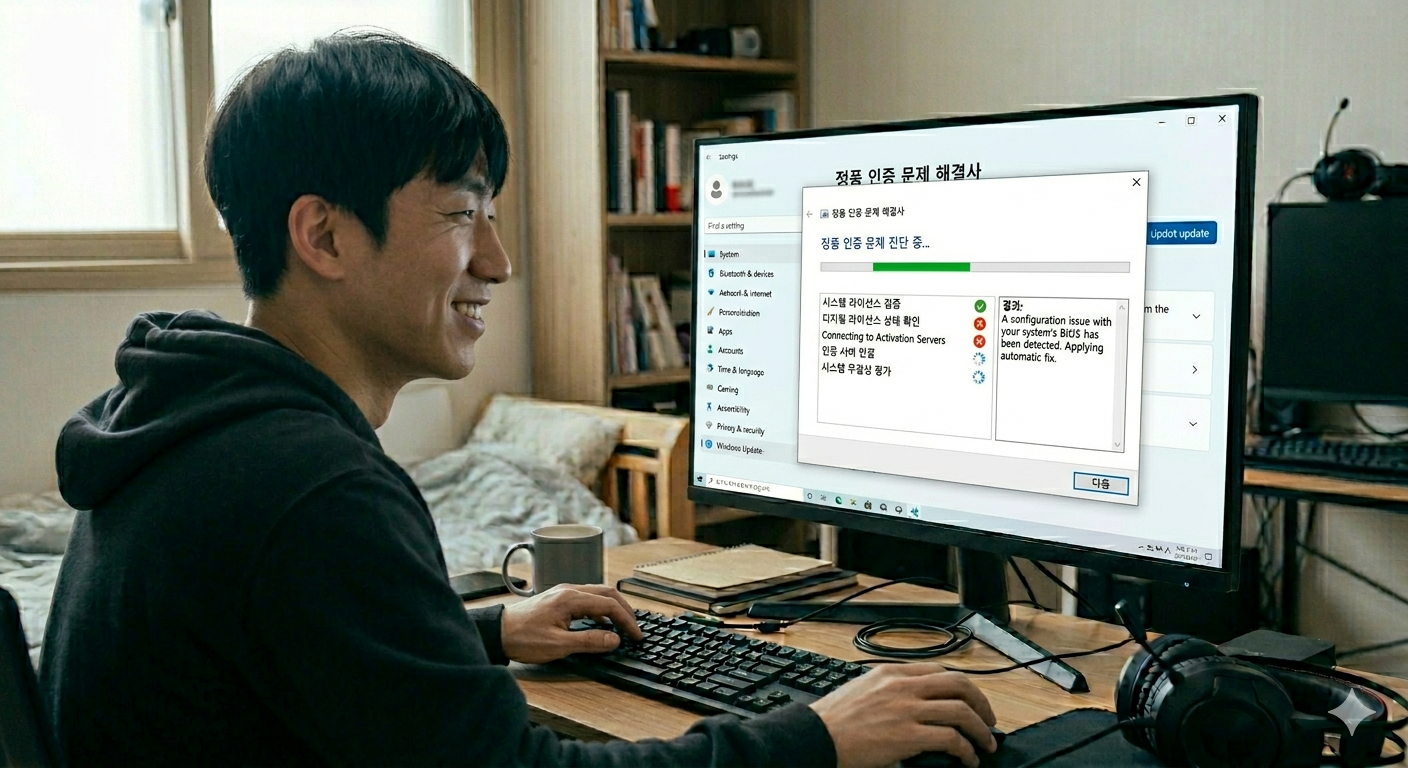 컴퓨터 문제 해결 도구를 사용하여 정품 인증 문제를 해결하는 모습