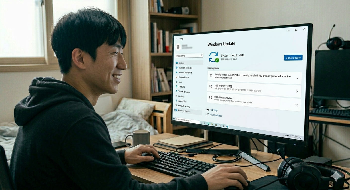 보안 업데이트를 설치하며 안심하는 사용자의 모습
