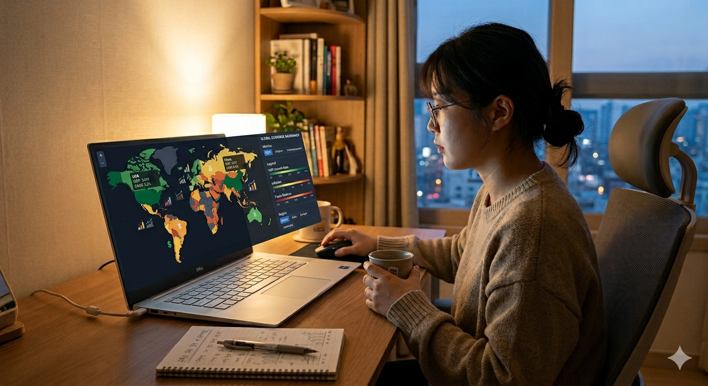 글로벌 지도 위에서 각 국가별 경제 상황을 나타내는 데이터가 시각화된 모습