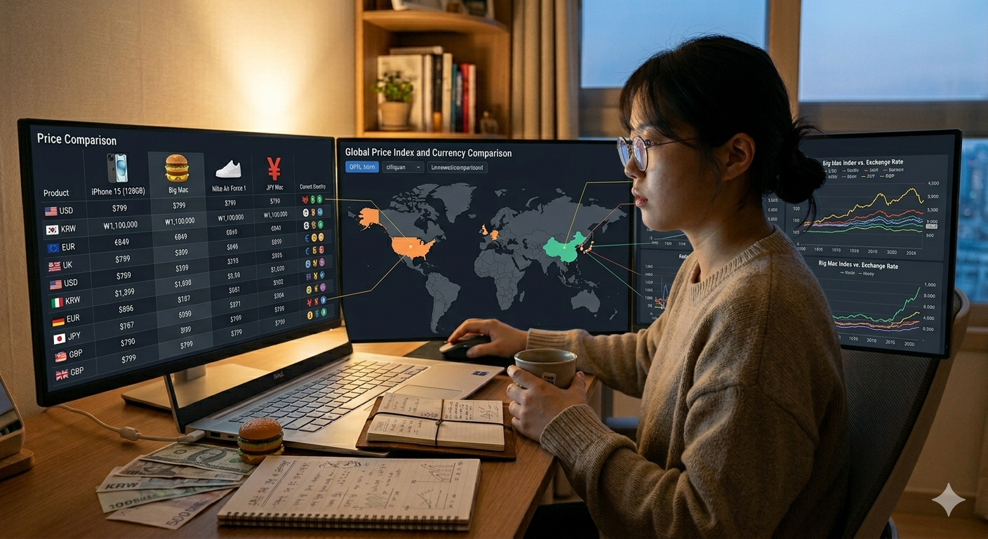 세계 지도를 배경으로 각국 화폐와 가격을 비교하는 모습