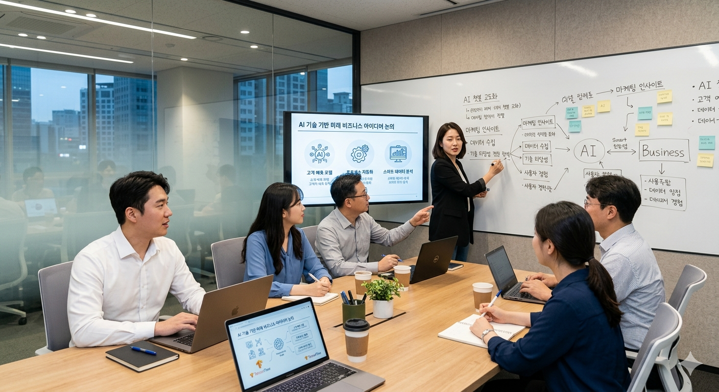 직장인들이 회의실에서 AI 기술을 활용한 아이디어를 논의하는 모습