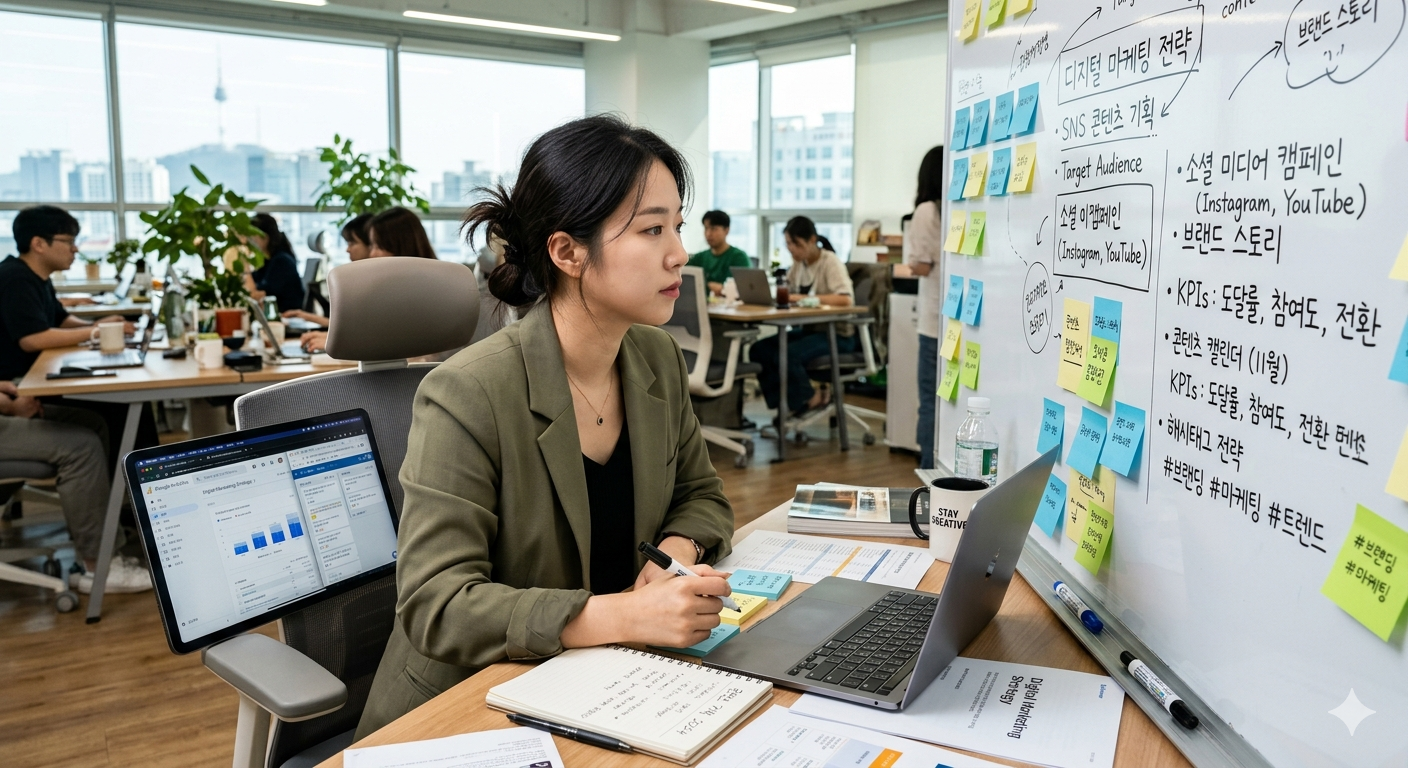디지털 마케팅 전략을 고민하며 콘텐츠를 기획하는 직장인의 모습