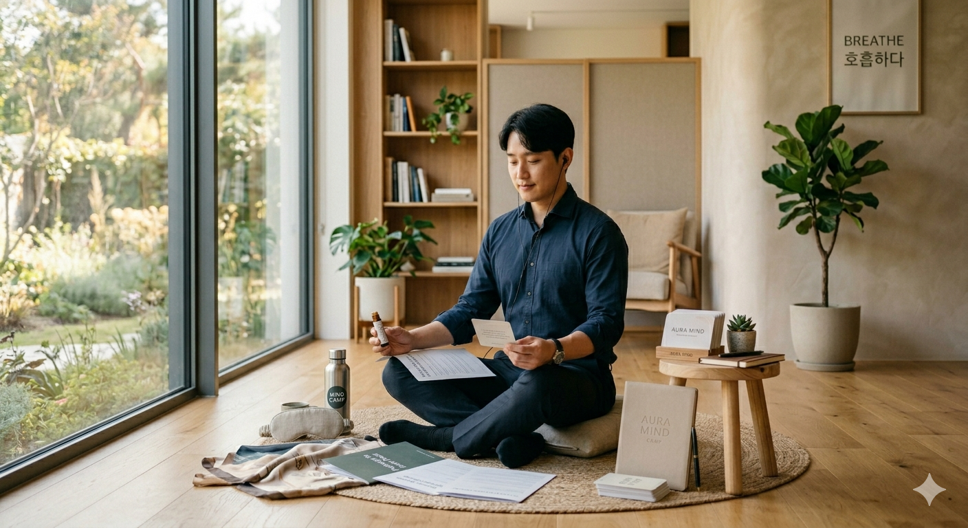명상 캠프에서 제공되는 자기계발 굿즈와 자료를 활용하는 모습