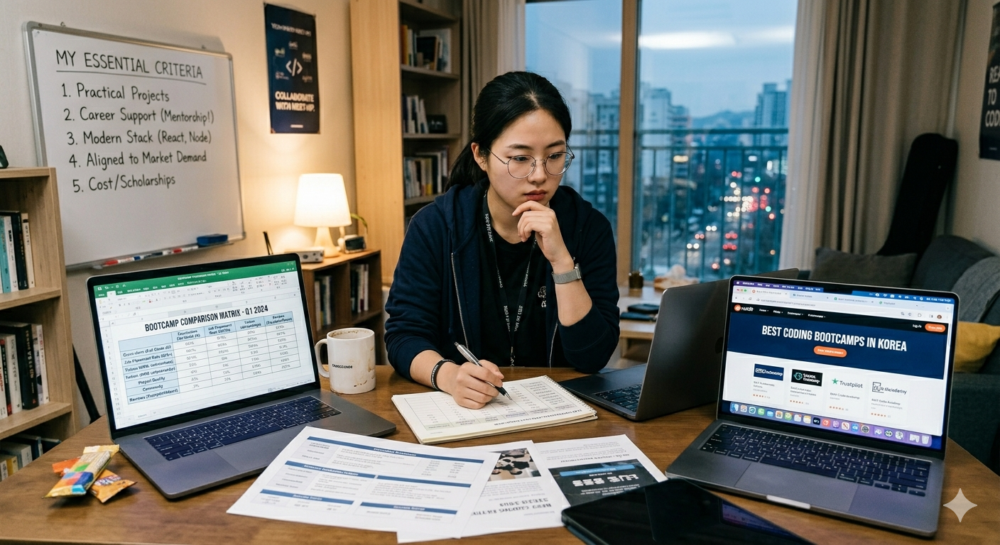코딩 부트캠프 선택 기준을 신중하게 검토하는 모습