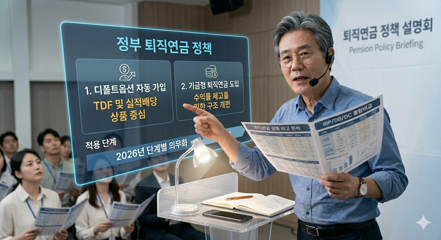 정부의 퇴직연금 정책을 설명하는 금융 전문가의 모습