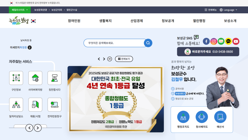 전남 보성군 홈페이지 메인 화면