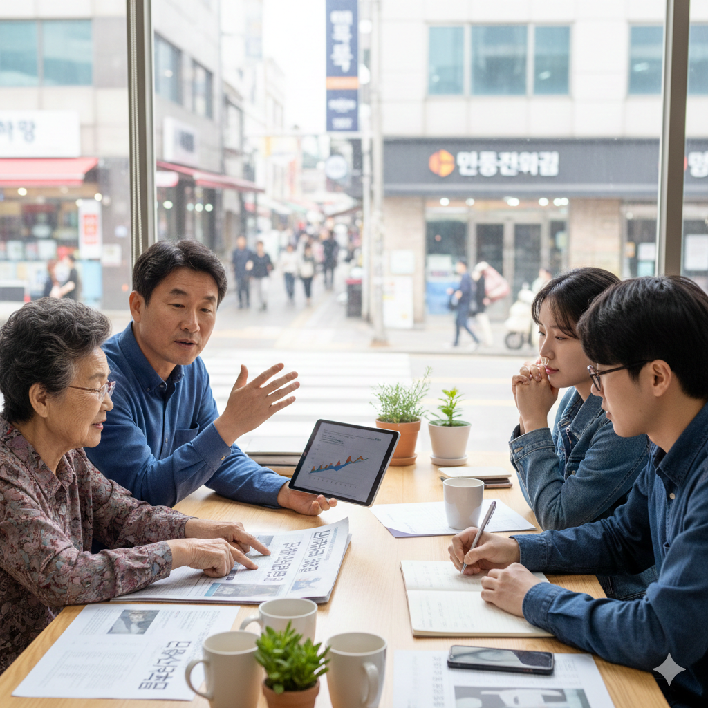 사람들이 민생지원금에 대해 이야기 나누는 모습