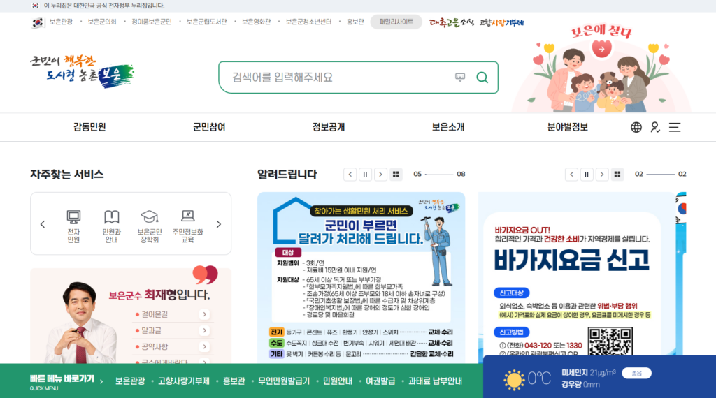 보은군 홈페이지 메인 화면
