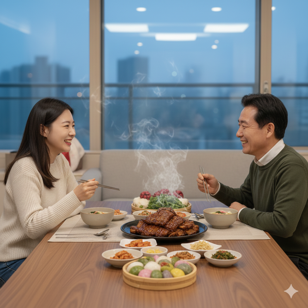 가족들이 식탁에 둘러앉아 갈비와 떡을 즐기는 모습