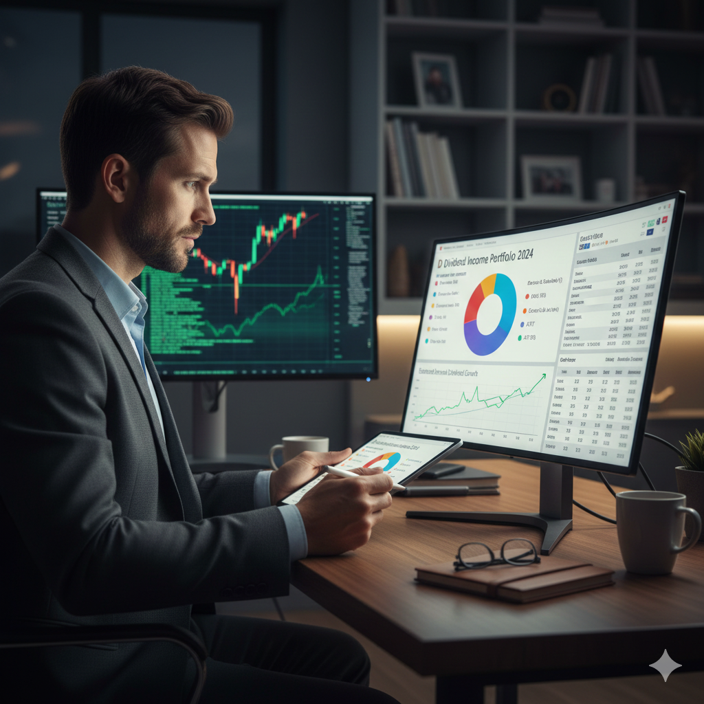 노트북으로 배당주 포트폴리오와 재무 데이터를 검토하는 투자자의 모습