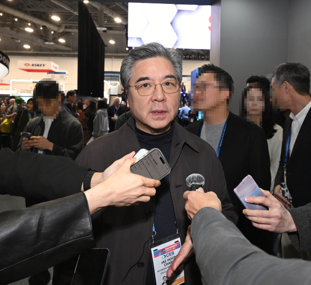 장재훈 현대차그룹 부회장이 7일(현지시간) 미국 라스베이거스에서 열린 CES 2026에서 부스를 관람하다가 언론 취재에 응하고 있다. 사진제공=현대차그룹