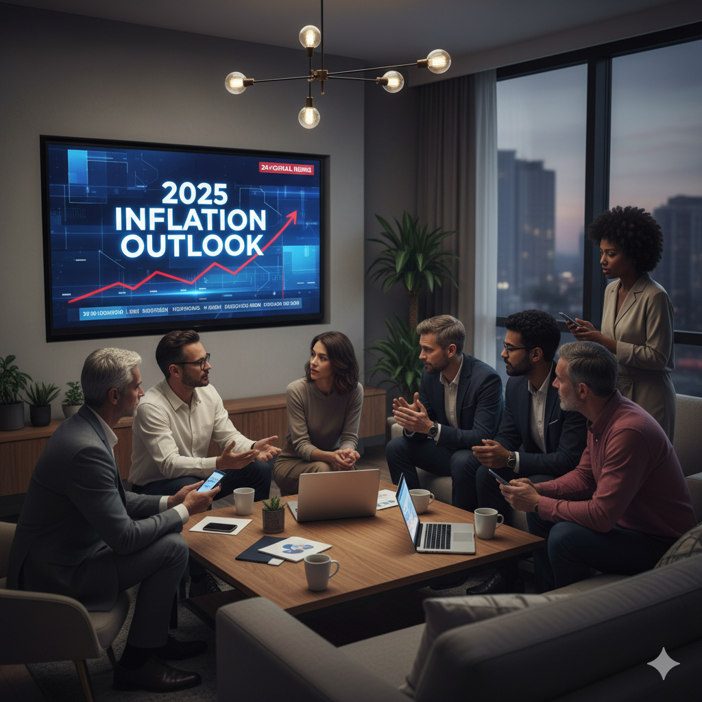 사람들이 경제 뉴스를 보며 2025년 물가 전망에 대해 이야기하는 모습