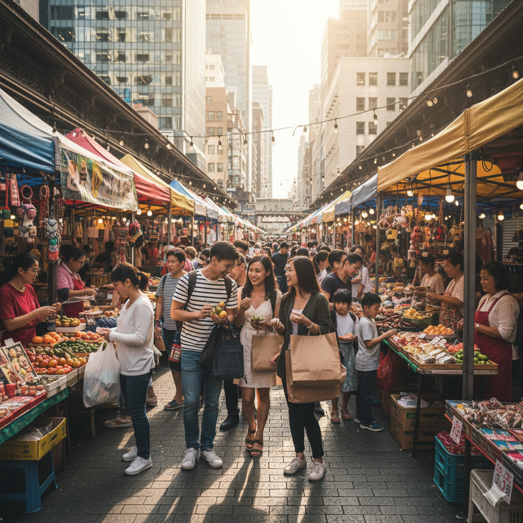 활기찬 시장에서 사람들이 쇼핑하며 소비하는 모습